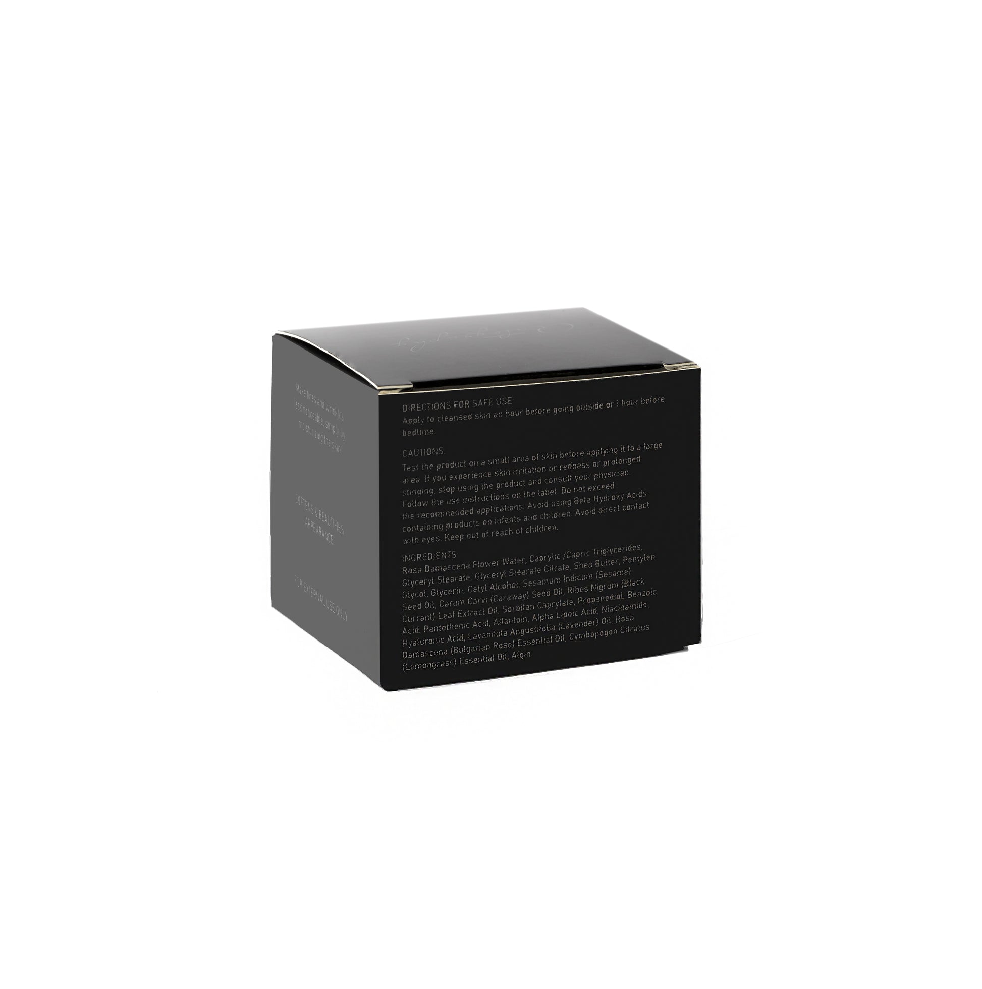Рожева вода дамаської троянди, каприлові/капринові тригліцериди, гліцерил стеарат, гліцерил стеарат цитрат, масло ши, пентиленгліколь, гліцерин, цетиловий спирт, олія насіння кунжуту, олія насіння кмину, олія з екстракту листя чорної смородини, сорбітан каприлат, пропандіол, бензойна кислота, пантотенова кислота, алантоїн, альфа-ліпоєва кислота, ніацинамід, гіалуронова кислота, олія лаванди вузьколистої, ефірна олія дамаської троянди, ефірна олія лемонграсу, альгін.